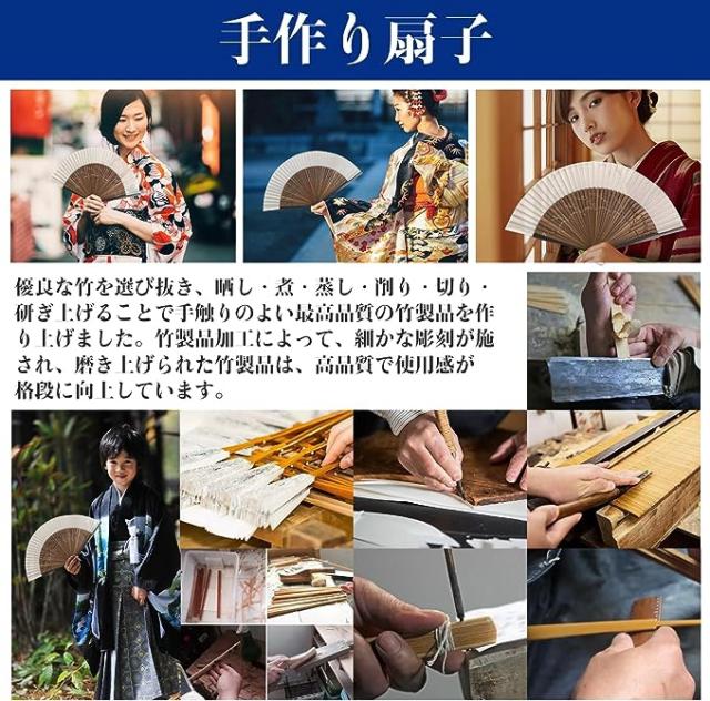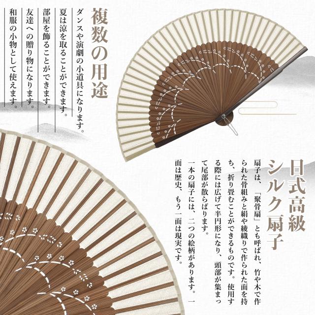 | 扇骨には青竹を使用し、扇面には本物の絹生地を使っています。これにより、扇子は高品質でありながら、自然な美しさと繊細さを兼ね備えています。頑丈な青竹の扇骨は軽くて丈夫であり、長時間の使用でも疲れにくいです。 | |