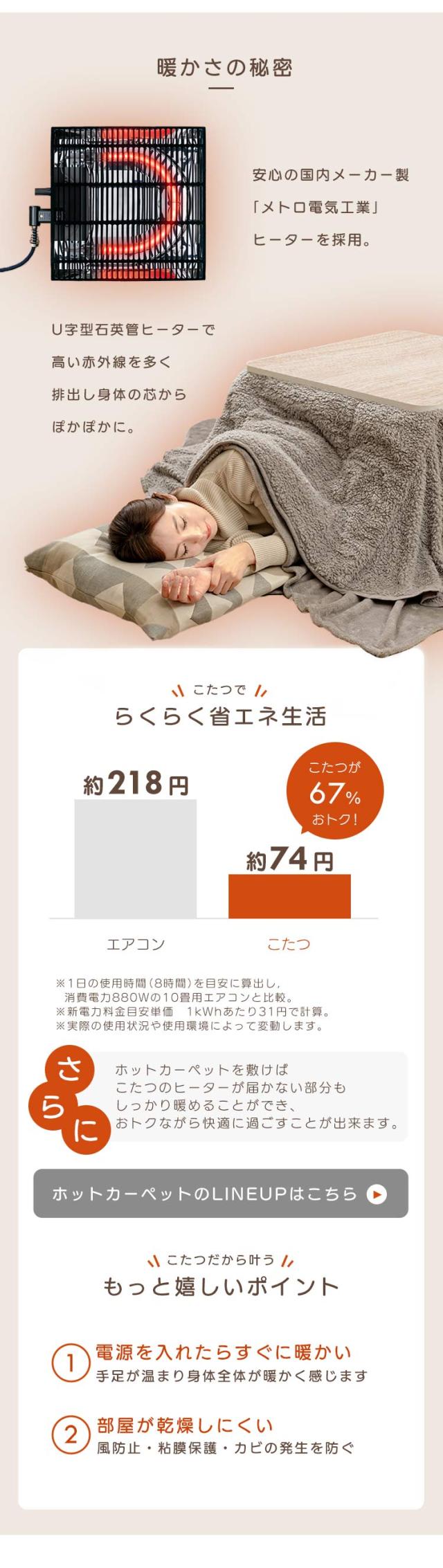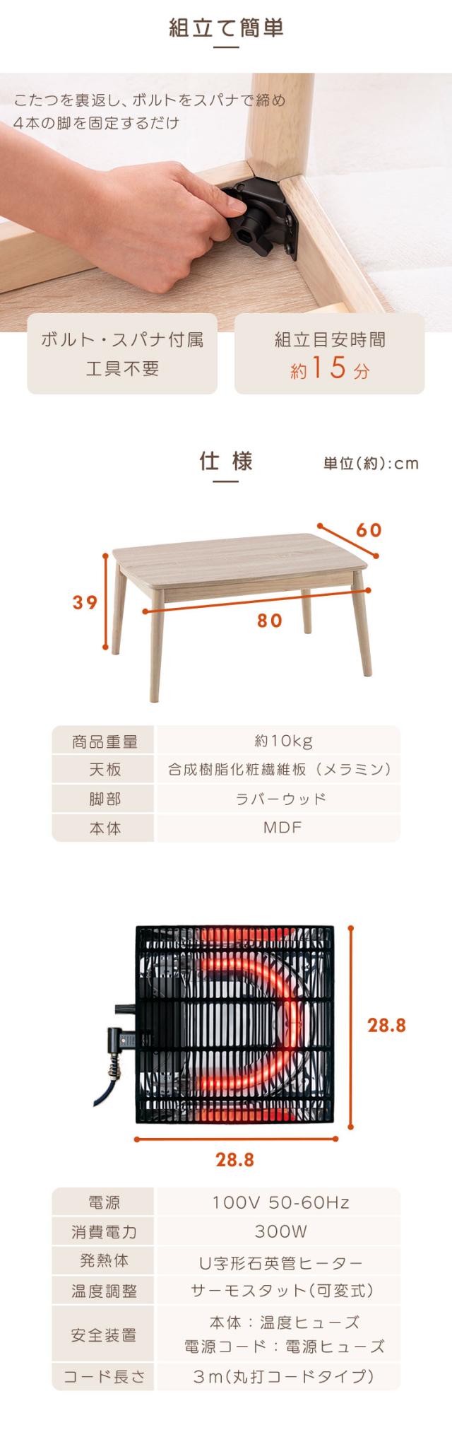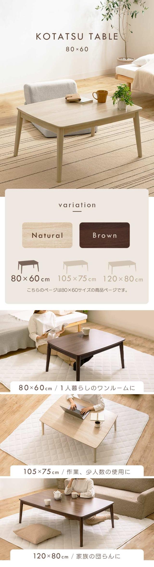 丸脚デザインこたつ 80×60 全2色 こたつテーブル コタツ 丸あし リビングテーブル 長方形 一人暮らし シンプル 省エネ 国内産ヒーター オールシーズン 送料無料