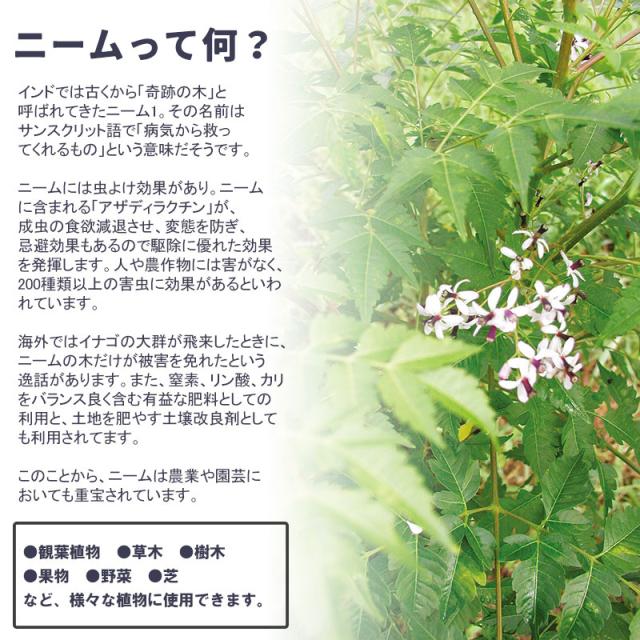 | 成分 | 粒:ニームの実(窒素1.2〜1.7%、リン酸0.2〜0.4%、カリ1.8〜2.2%) |