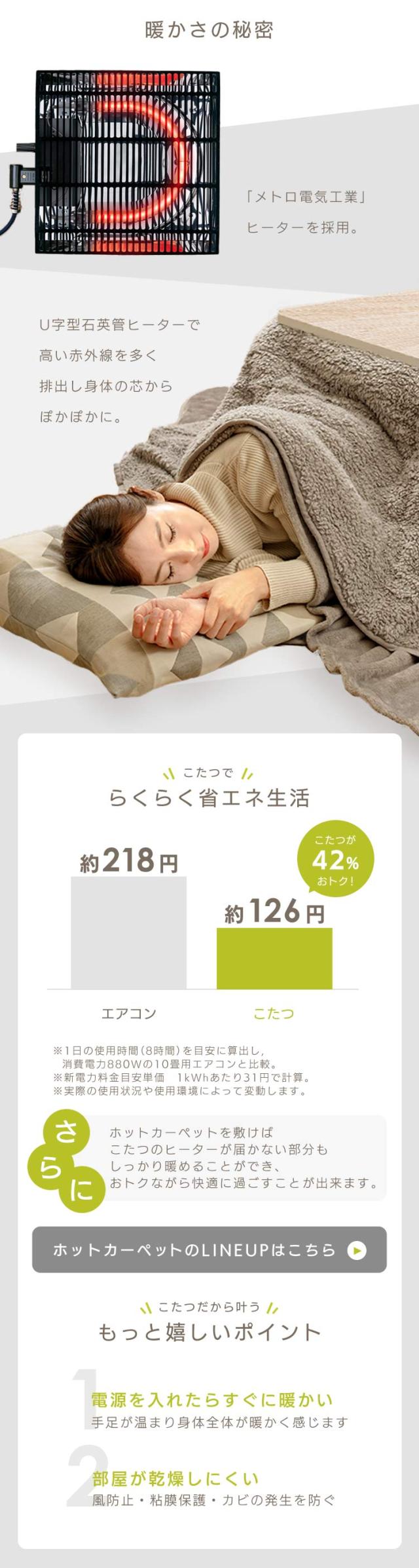 エアコンやファンヒーターに比べて消費電力の小さいこたつは、賢く使って「節電」にも。