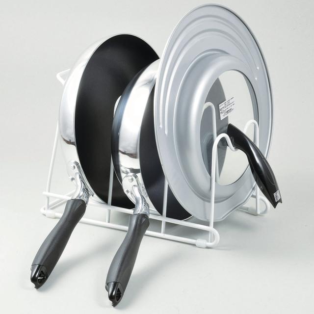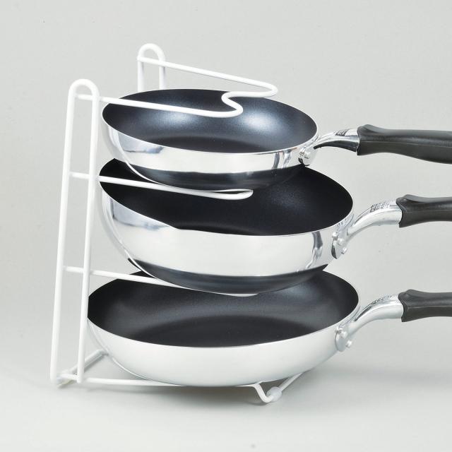 フライパンをまとめてすっきり収納できるフライパンラックです。使いたい時に必要なフライパンをサッと片手で取ることができ、調理もスムーズにはかどります。