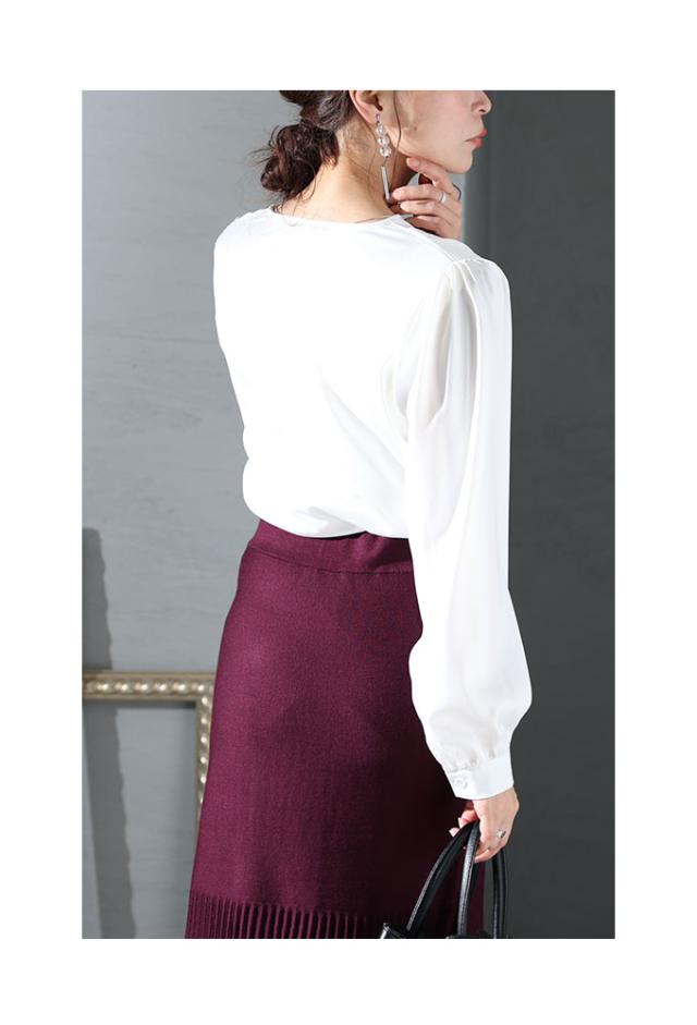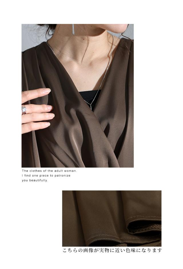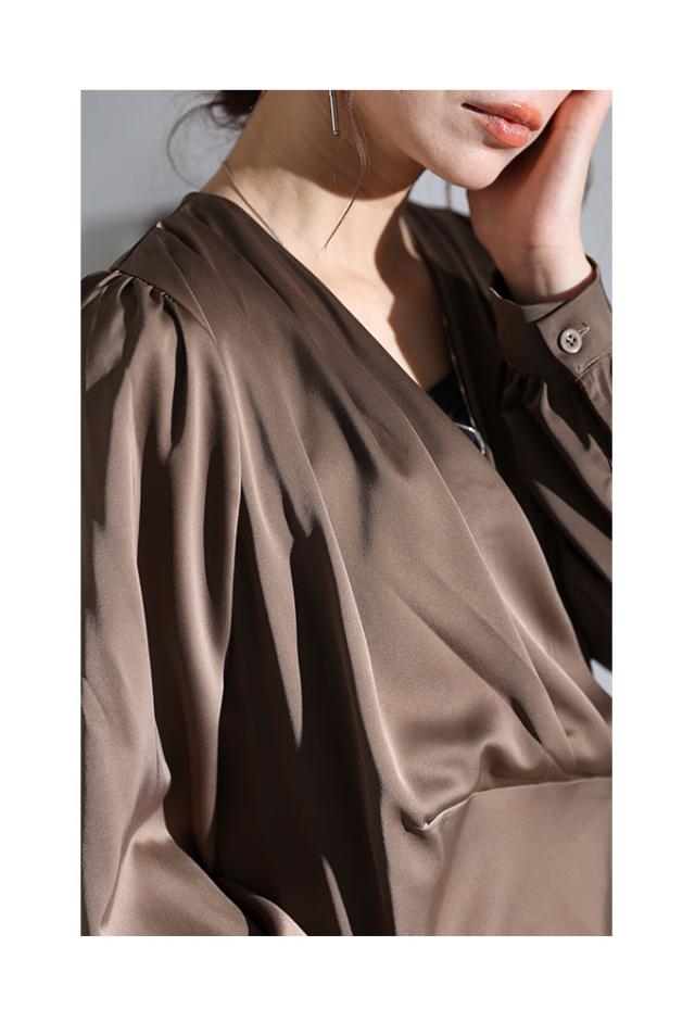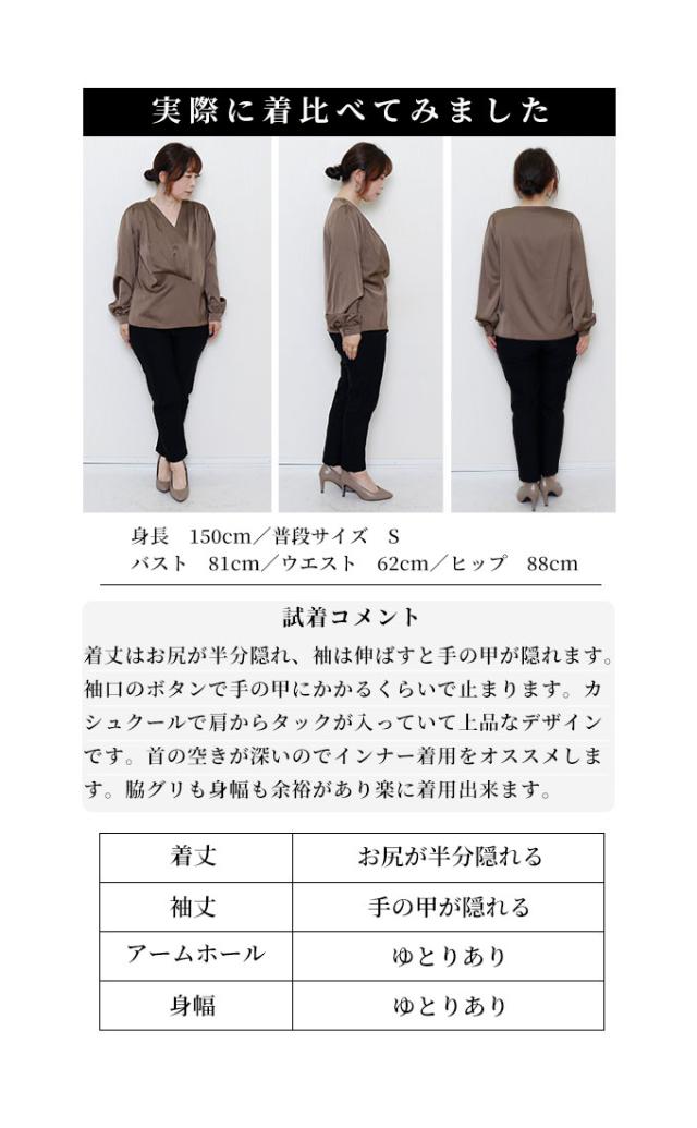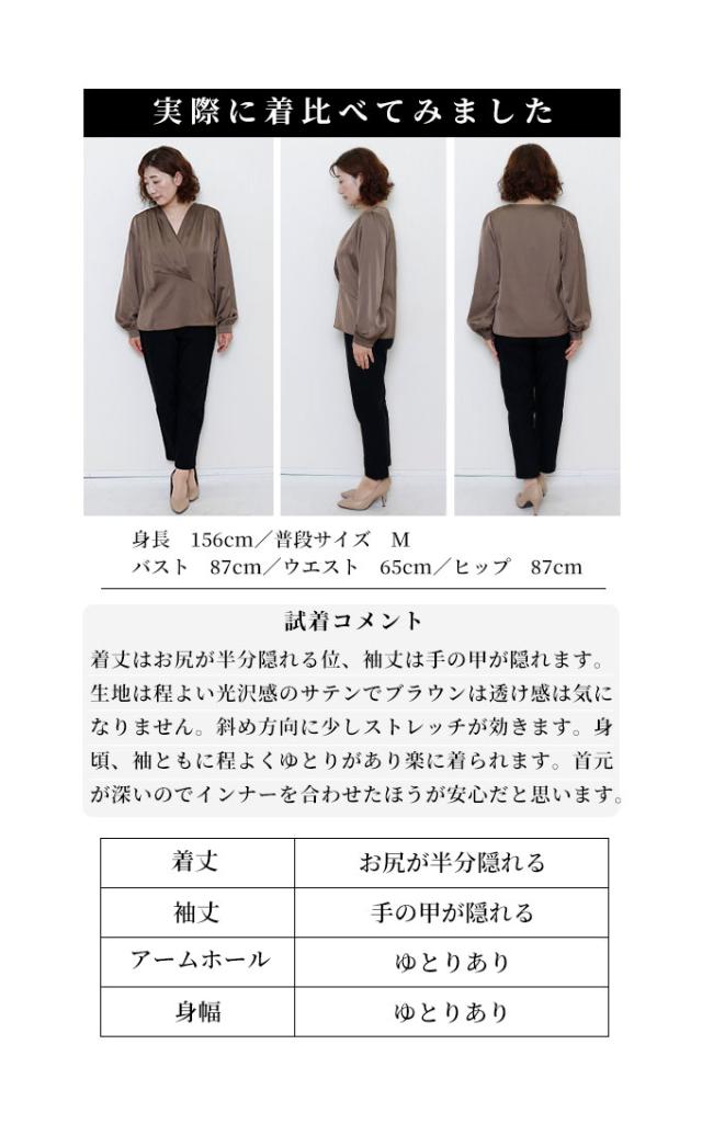 着丈はヒップが半分隠れるくらい、袖丈は手の甲が隠れるくらいでした。生地は程よい光沢感のサテンで、透け感はありません。斜め方向に少しストレッチが効きました。身頃、袖ともに程よくゆとりがあり、楽に着られました。肩からタックを入れふんわりしたカシュクールで、首元はやや深めのVネックです。カシュクール部分にボタンなどの留めるものがないので、インナーを合わせたほうが安心だと思います。肩はギャザーが入っていて、ふんわりしています。ウエストの斜め切り替えがポイントになっています。いかにもサテン風なテカリ方ではないので、スーツのインにもいいですね。