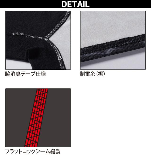 脇消臭テープ仕様、制電糸(裾)、フラットロックシーム縫製
