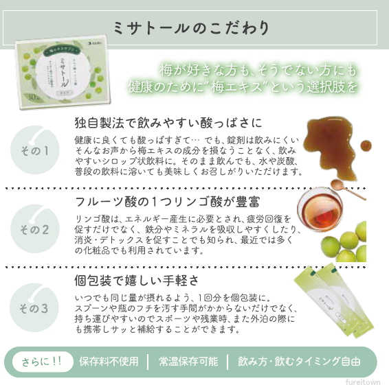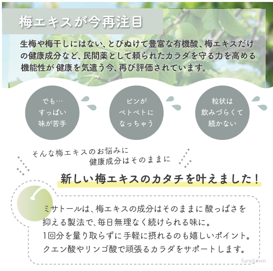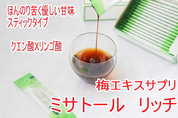 【ふれ i タウン】の地元、群馬県高崎市箕郷地区を含む榛名山麓は、日本では和歌山県に次ぐ全国第2位の梅の産地です。 でも知名度は低く安価な中国産に押され、苦戦中です。 そこでAdaBio株式会社(群馬県高崎市)は輸入梅を一切使わず、良質で健康な青梅を厳選して使用した、安全で安心な全く新しいタイプの健康補助食品を開発しました。県内では病院や医院の売店で販売しています。 「ミサトールデリシャス」の販売以来、「ミサトール」の健康増進作用について鋭意研究を重ねて参りました。 「ミサトールリッチ」は、ミサトールGLと同様に梅特有の酸味を抑えることにも成功しており、酸っぱいのが苦手な方にも喜んでお召し上がり頂けるようになっております。 また、保存料も含まれておりませんので、安心して長期間ご愛用下さい。
