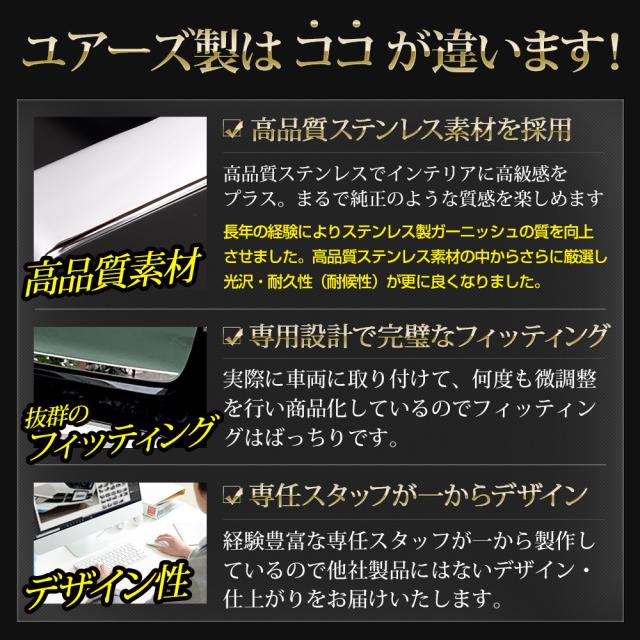 | 高品質なステンレスを使用した、純正のような深い光沢のメッキパーツが登場。 エクステリアに高級感をプラスして、ワンランク上のドレスアップを手に入れられます! 実際に車両に取り付け、何度も微調整を行い商品化しているのでフィッティングはバッチリ。 経験豊富な専任スタッフが一から制作しているので他社製品にはないデザイン・仕上がりをお届けいたします! 届いた時点で強力両面テープがメッキ裏面についておりますので、あとは取り付け箇所をしっかり脱脂して貼り付けるだけでOKです! |