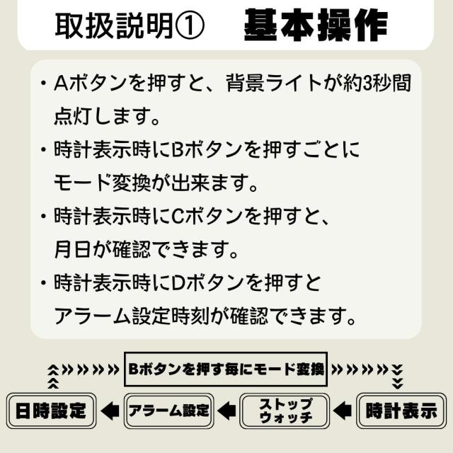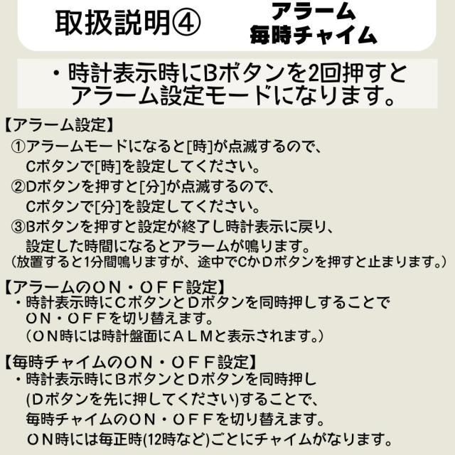 - 注文翌日に届きました。 息子は、カッコいいと喜んでいました。 時刻合わせは出来ましたが、8時9時10時…と1時間毎にピーとなります。なぜなるのか分かりませんが、説明書がないので解除の仕方も分かりませ...