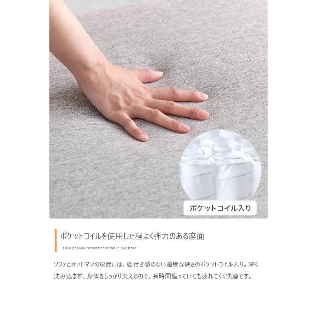 ソファとオットマンの座面には、適度な硬さのポケットコイル入りクッション。深く沈み込まずにしっかりとサポートし、長時間座っていても快適な座り心地を提供します。
