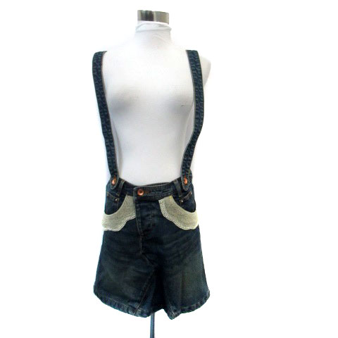 【中古】フランシュリッペ デニムスカート 台形スカート ミニ サスペンダー付き ボア フェイクパール S 紺 レディース