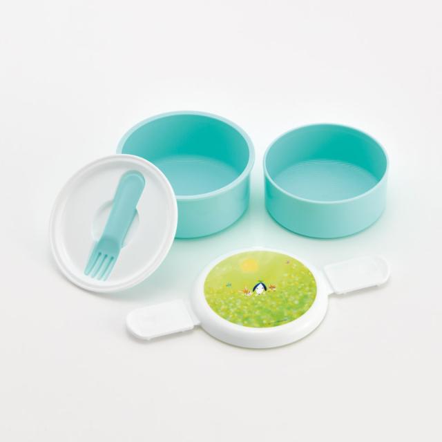 丸型のかわいい2段タイプのランチボックスです。プラスチック製のミニフォーク付きで別でカトラリーを持ち歩かなくても大丈夫。食べ終わった後は、下段に上段を収納できる入れ子式で、コンパクトに持ち帰ることができます。