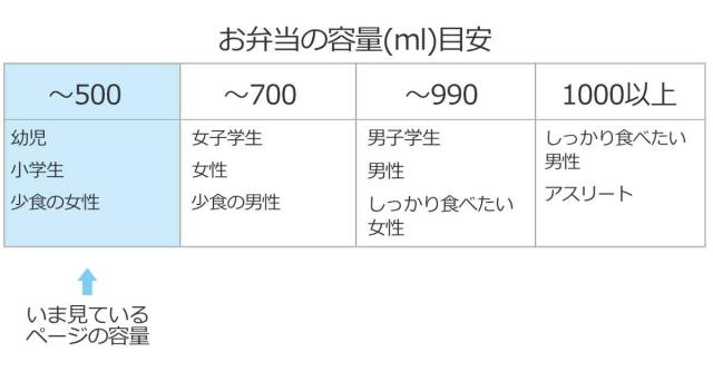 | 容量 | 総容量:500ml 上段:230ml、下段:270ml |