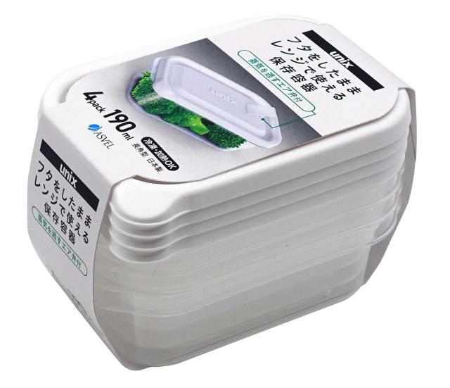UNIX レンジ名人 長角SS 4P●フタをしたままレンジで使える保存容器です。フタをしたまま加熱が出来る便利な保存容器です。冷凍も可能。様々な用途で使い分けられる4個セットです。・蒸気を逃すエア弁付き・便利な持ち手付き・重ねて使える・便利な目盛り付きカラーホワイトサイズ(約) 幅12.4×奥行8.2×高さ4.3cm容量(約)190ml×4P材質本体・フタ=ポリプロピレン生産国日本関連キーワード:キッチン用品 キッチン小物 保存容器 調理器具 保存ケース 電子レンジ対応 冷凍対応 加熱OK