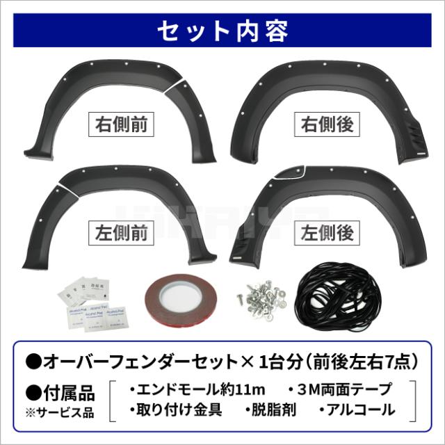 | セット内容 | ・オーバーフェンダーセット×1台分(前後左右7点) ・付属品(エンドモール約11m・3M両面テープ・取付金具・脱脂剤・アルコール) |
