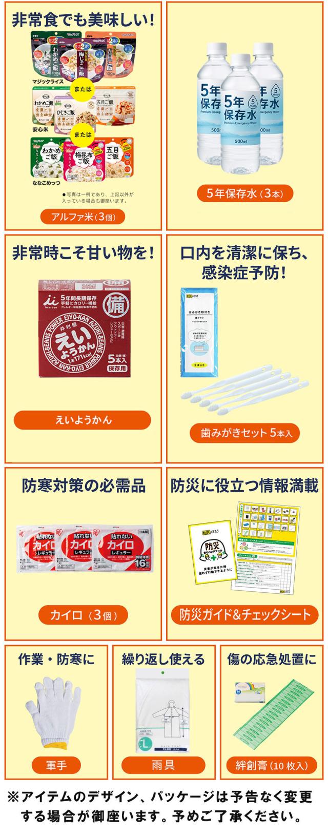 | 保存の効くスイーツ×1 | 甘いパン、ようかん、クッキー等、いずれかのお菓子が1つ入ってます |