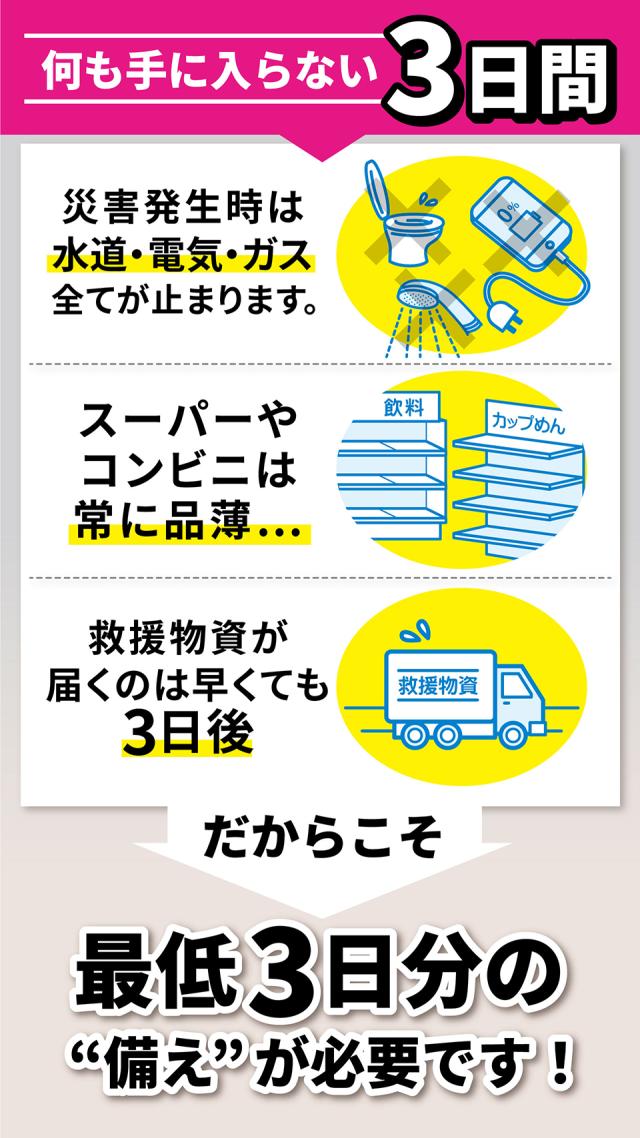 | アルファ米×3 | 種類(梅じゃこご飯、五目ご飯、わかめご飯) [梅じゃこご飯]原材料:うるち米(国産)調味顆粒(食塩・カツオ節粉末・砂糖・その他)、味付け梅、味付けちりめんじゃこ、ねぎ/調味料(アミノ酸等)、酸味料、着色料(赤キャベツ・カラメル)、酸化防止剤(V.E)または[ドライカレー]原材料:うるち米(国産)、調味顆粒(調味香辛料、香味調味料、砂糖、ブイヨン、調味パウダー、カレー粉)、味付けとうもろこし、味付けにんじん、味付けたまねぎ/調味料(アミノ酸等)、香辛料抽出物、甘味料(カンゾウ)、香料、微粒二酸化ケイ素、酸化防止剤(ビタミンE) [五目ご飯]うるち米(国産)、具(たけのこ・れんこん・にんじん・ごぼう・しいたけ)、食塩、砂糖、かつお節エキス、デキストリン、しいたけエキス、発酵調味料、風味調味料(かつお等)、酵母エキス、植物油脂/調味料(アミノ酸等)、着色料(カラメル)、酸化防止剤(V.E)、漂白剤(自亜硫酸Na) [わかめご飯]うるち米(国産)、わかめ、調味顆粒(食塩・酵母エキス)/調味料(アミノ酸等)、酸味料 内容量:100g |