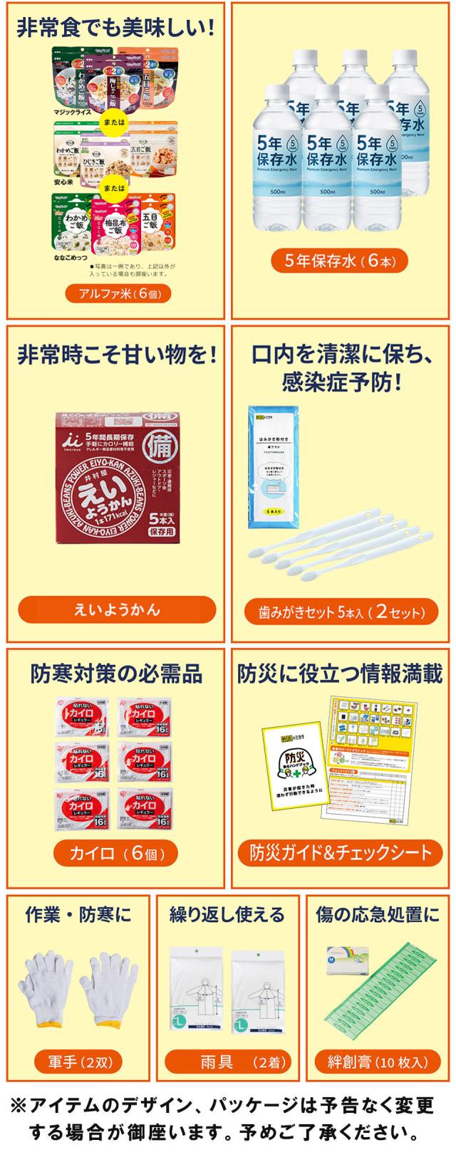 | 保存の効くスイーツ×1 | 甘いパン、ようかん、クッキー等、いずれかのお菓子が1つ入ってます |