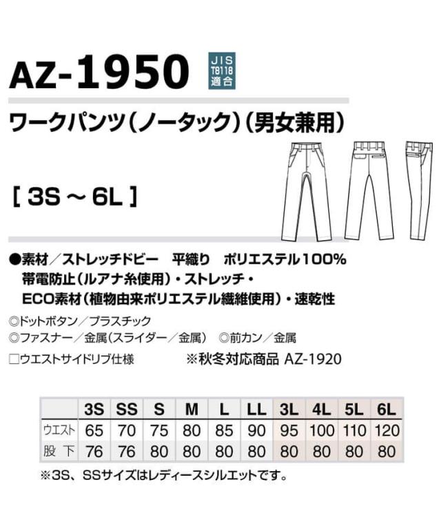 AITOZ アイトス ノータックワークパンツ AZ-1950 エコ素材 軽量 ストレッチ 帯電防止 春夏 作業服 男女兼用 サイズ3S〜LL