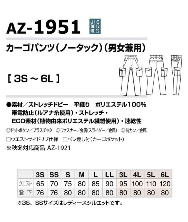 AITOZ アイトス ノータックカーゴパンツ AZ-1951 エコ素材 軽量 ストレッチ 帯電防止 春夏 作業服 男女兼用 サイズ3S〜LL