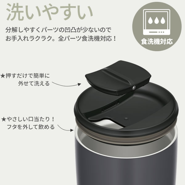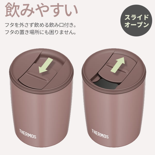 フタを付けたまま飲めるスライド式開閉の飲み口付き。取り外しの手間がなく、フタの置き場にも困りません。