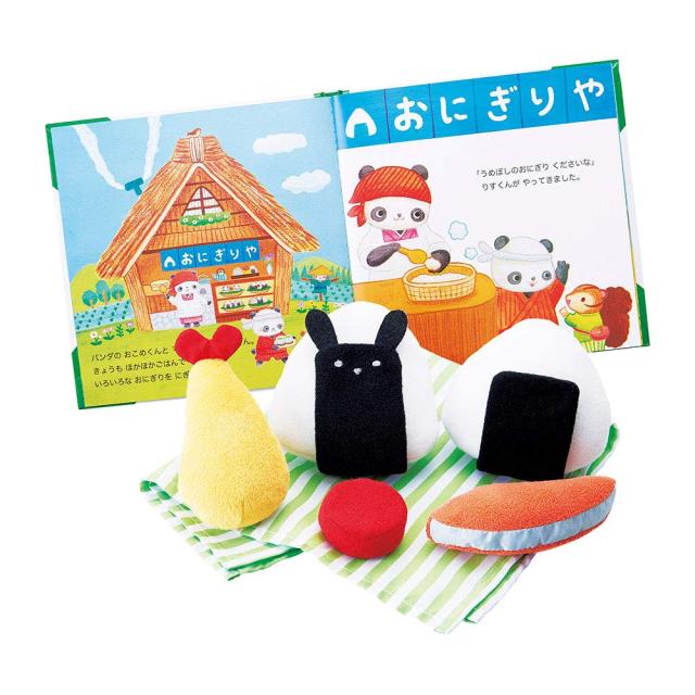 ・パッケージサイズ:w24×d6.5×h24cm<br>【素材】<br>・フェルト<br>【セット内容】<br>・絵本×1、おにぎり(ポケットなし)×1、おにぎり(ポケットあり)×1、のり(ノーマル)×1、のり(うさぎ型)×1、うめぼし・サケ・エビフライ×各1、クロス×1<br>【対象年齢】<br>・1歳半~<br>絵本と布おもちゃがいっしょになった『えほんトイっしょ』シリーズ。絵本を読みながらお子さまと一緒におにぎりが作れる体験型の知育絵本です。