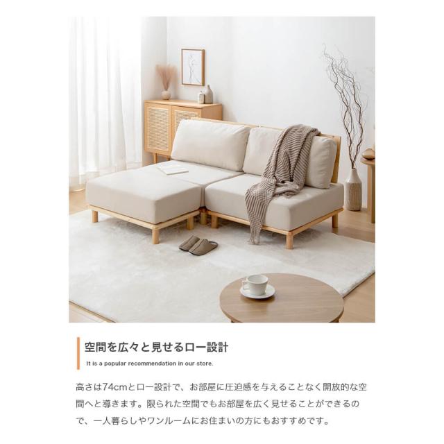 オットマンを組み合わせることで、さらに広いスペースを活用できます。アームレスのデザインにより、ソファ全体の圧迫感が軽減され、お部屋をすっきり広く見せることが可能です。