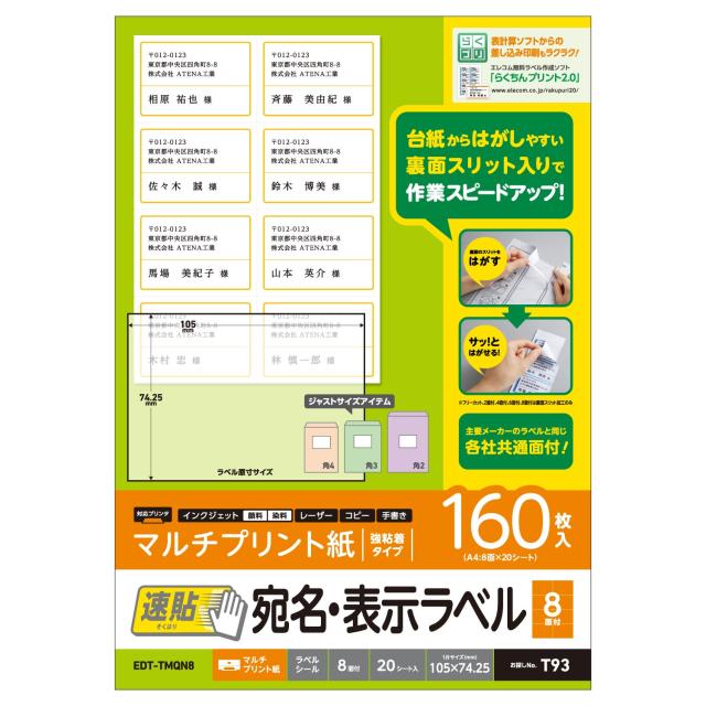 【在庫処分・お買い得!】 エレコム 宛名表示ラベル 速貼タイプ ラベルシール 160枚(20シート×8面) ホワイト┃EDT-TMQN8