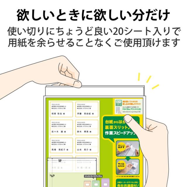 作業効率が大幅アップ!台紙からはがしやすく、効率よく宛名貼り作業を行える『速貼』宛名・表示ラベル。![]() ■ラベルを簡単にはがせる裏面スリット入りで台紙からはがしやすく、作業効率が大幅にアップする『速貼』宛名・表示ラベルです。 ■マルチタイプの用紙なので、インクジェットプリンタ、レーザープリンタ、コピー機でも印刷可能です。 ■角2封筒など大きめの封筒や物流に適したサイズです。 ■主要メーカーラベルと同じ各社共通面付タイプです。 ■手書きも可能で、手軽に宛名・表示ラベルを作成することができます。 ■無料でダウンロードできるエレコムのラベル作成ソフト「らくちんプリント」で、簡単にデザイン・印刷が可能です。また、表計算ソフトからの差し込み印刷も簡単です。 ■自社環境認定基準を1つ以上満たし、『THINK ECOLOGY』マークを表示した製品です。 ■環境保全に取り組み、製品の包装容器が紙・ダンボール・ポリ袋のみで構成されている製品です。 ![]() ■用紙サイズ:幅210mm×高さ297mm ※A4サイズ ■一面サイズ:105mm×74.25mm ■ラベル枚数:160枚 ※20シート×8面 ■用紙タイプ:マルチプリント紙 ■カラー:ホワイト ■紙厚:0.15mm ■坪量:140g/m2 ■テストプリント用紙:テストプリント用紙1枚入り ■お探しNo.:T93 ■セット内容:ラベル×20シート、テストプリント用紙×1枚 ■その他:面付:8面 |