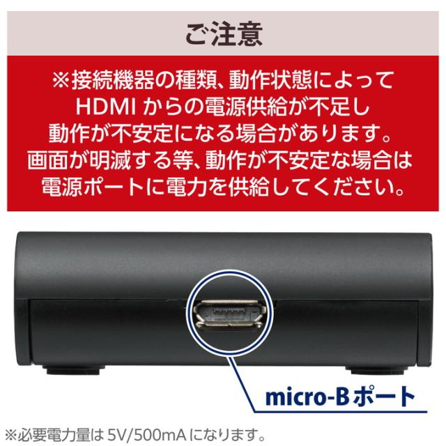テレビなどのHDMI(R)ポート不足を解消!複数のHDMI機器の映像・音声を切り替えて、1台のテレビに出力ができるHDMI切替器。![]() ■複数のHDMI機器の映像・音声を切り替えて、1台のテレビに出力ができるHDMI切替器です。 ■本製品は2K(1920x1080) 60Hzまでの1080p対応、及びWUXGA(1920×1200) 60Hzまでの対応商品です。 ■4K(2160p)のテレビなどを接続してご使用の場合は、ご使用になる機器の出力解像度を2K(1080p)に固定してご利用ください。 ■なお、2K(1920x1080)やWUXGA(1920×1200)を超える解像度或いは、120Hzや165Hz、240Hzなどの60Hzを超えるリフレッシュレートには対応しておりませんのでご注意ください。 ■HDDレコーダー、BD/DVDプレーヤー、ゲーム機などのHDMI機器を3台接続可能です。 ■テレビのHDMI入力端子が不足していても、ケーブルの差し替えをせずにHDMI機器を利用可能です。 ■HDMI機器から電力を供給するため、ACアダプタなど外部電源を必要とせずに利用可能です。 ■HDMI機器からの電源供給が少ない場合でも、安定動作ができるようにするための外部電源ポートが付いています。必要に応じて本体側面の外部電源ポート(microUSB端子)に電力を供給してください。(※USBケーブル・ACアダプタは別売です) ■接続されているHDMI機器が起動すると、自動的に接続される自動切替機能が付いています。 ■※既に起動している機器への切替は、本体天面のボタンで切替可能です。 ■本体とテレビとの接続用にHDMIケーブル1本が付属しています。 ■テレビ周りに設置しても邪魔にならないコンパクトサイズです。 ■HDMIケーブルをすべて同じ方向に、すっきりと配線可能です。 ■法人で導入を検討されるお客さまは、ご購入前にお客様の環境での検証をおすすめ致します。 ■自社環境認定基準を1つ以上満たし、『THINK ECOLOGY』マークを表示した製品です。 ■環境保全に取り組み、製品の包装容器におけるプラスチック重量を、社内基準製品より20%以上削減した製品です。 ■環境保全に取り組み、製品の包装容器が紙・ダンボール・ポリ袋のみで構成されている製品です。 ![]() ■対応映像出力機器:HDMI出力端子を搭載したAV機器・家庭用ゲーム機・パソコン等 ■対応映像表示機器:HDMI入力端子を搭載したテレビ・ディスプレイ・プロジェクター等 ■コネクター形状:入力:HDMIタイプA 19ピン(メス)×3/出力:HDMIタイプA 19ピン(メス)×1/電源:USB[microB]メス ■HDMI規格:High Speed with Ethernet(HDMI 1.4a/HDCP対応) ■対応解像度:1080p(1920×1080)60Hzまで、WUXGA(1920×1200)60Hzまで ■色深度:Deep Color(36bit:12bit/各色) ■データレート:最大7.5Gbps ■対応音声フォーマット:DTS Digital、Dolby Digital ■サイズ:幅95×奥行46×高さ15 (mm) ■添付品:HDMIケーブル(1m)×1本 ■保証期間:6カ月間 ■環境配慮事項:EU RoHS指令準拠(10物質)、環境配慮パッケージ |