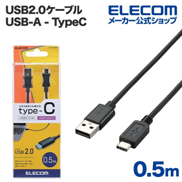 エレコム USB2.0ケーブル(A-TypeC)0.5m ブラック 0.5m┃U2C-AC05BK