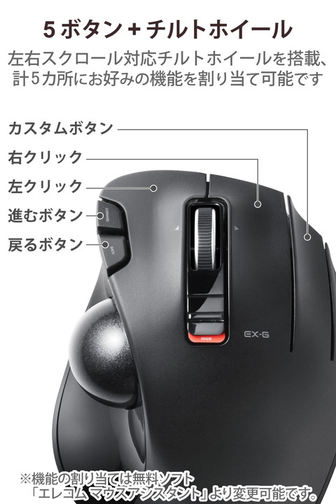 エレコム トラックボールマウス ワイヤレス 親指操作タイプ 親指 6ボタン チルト機能 無線 高性能 ブラック┃M-XT3DRBK