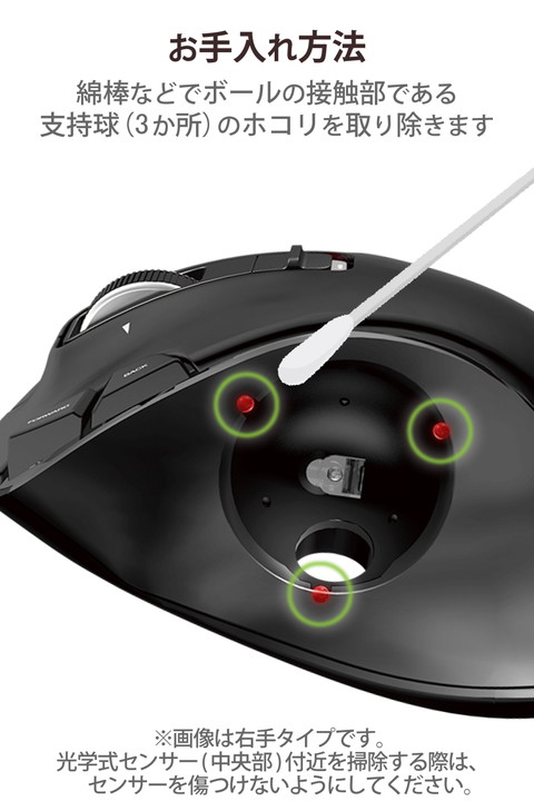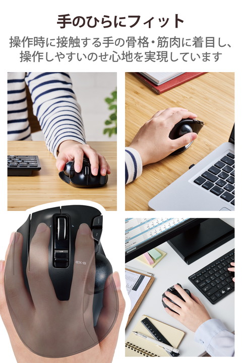 直径2.5mmの大型人工ルビーを支持球に採用。確かな基本性能とかつてない新機能を搭載し、進化したポインタ追従性を実現する左手・親指操作タイプのワイヤレストラックボール。![]() ■確かな基本性能とかつてない新機能を搭載した、左手用・親指操作タイプのワイヤレストラックボールです。 ■トラックボールの動きを検出するセンサーに、ゲーミンググレードの高性能光学式センサーを搭載し、新型の高性能レンズと周辺の光学設計の最適化で抜群のポインタ追従性を実現しています。 ■直径2.5mmの大型人工ルビーを支持球に採用することで、操球感が向上しています。また支持球の大径化により、支持球が手あか等のゴミに埋もれにくくなり、メンテナンス頻度が低減しています。 ■操作時に接触する6つの手の骨格・筋肉に着目し、窪みや膨らみを考慮した設計により、まるで手のひらの形状がそのまま映し出されたかのような、操作しやすい新しい「のせ心地」を実現しています。 ■Webページ閲覧の効率を上げる「進む」、「戻る」ボタンを搭載しています。ボタンの大きさ・形状の工夫により、よりアクセスしやすくなりました。 ■薬指の場所にカスタマイズ可能なファンクションボタンを1つ搭載しています。 ■左右のボタンには、耐久性の面で信頼性が高く、クリック感にも定評のあるOMRON社製スイッチを採用しています。 ■ホイールを傾けるだけで左右にスクロールできるチルトホイールを搭載しています。Excelなどの横に長い画面の操作に便利です。 ■ポインタの移動速度を1500/750カウントの2段階に切り替えできる速度変更スイッチが付いています。 ■ボタンの機能割り当ては、無料でダウンロードできる「エレコム マウスアシスタント」を利用して変更可能です。 ■裏面の穴から簡単にボールを取り外しでき、ボールや内部のボール受けのメンテナンスがしやすい設計です。 ■無線方式は2.4GHz帯を採用し、非磁性体で約10m、スチールデスクなど磁性体上でも約3mの範囲で使用可能です。(当社調べ) ■ノートパソコンのUSBポートに接続しても気にならず、装着したまま持ち運び可能な1円玉サイズのマイクロレシーバを採用しています。 ■レシーバはマウス本体内に収納可能なので、持ち運びに便利で、レシーバを紛失する心配を軽減します。 ■本体裏面に電源スイッチがあり、不使用時の電池の消耗を防止できます。 ■電池の交換時期をお知らせする電池残量表示ランプを搭載しています。 ■開梱作業がしやすい簡易パッケージモデルです。 ■交換用ボールの用意がございます。対応する製品は 型番:M-B1RD になります。 ![]() ■インターフェース:USB ■コネクター形状:USB-Aオス ■対応機種:USBポートを装備したWindows OS、macOS搭載機 ■対応OS(Windows):Windows 11/10/RT8.1/8.1/7/Vista ■対応OS(macOS):macOS Sonoma 14/macOS Ventura 13 ■対応OS 備考:※各OSの最新バージョンへのアップデートや、サービスパックのインストールが必要になる場合があります。※Windows RT8.1では横スクロール機能は使用できません。 ■分解能:750/1500カウント(切り替え可能) ■通信方式:GFSK方式 ■電波周波数:2.4GHz帯 ■電波到達距離:磁性体(鉄の机など)の上で使用する場合:3m、非磁性体(木の机など)の上で使用する場合:10m ■読み取り方式:光学センサー方式 ■射出光線種類:不可視波長域 ■ボタン数:6個 ※ホイールボタン含む ■ホイール数:1個 ■ボール径:直径約34mm ■横スクロール機能:○ ■レシーバー収納:○ ■連続動作時間:ローエナジーモード:約125時間、ハイスピードモード:約76時間 ■連続待機時間:ローエナジーモード:約694日、ハイスピードモード:約694日 ■想定電池使用期間:ローエナジーモード:約273日、ハイスピードモード:約176日 ※1日8時間のパソコン操作中5%をマウス操作に割り当てた場合 ■電源(本体):単3形アルカリ乾電池、単3形マンガン乾電池、単3形ニッケル水素電池のいずれか1本 ■定格電圧(本体):1.5V ■カラー:ブラック ■外形寸法(マウス本体):幅94.7mm×奥行124.4mm×高さ47.9mm ■サイズ分類:Lサイズ ■重量(マウス本体):約128g ※電池を含まず ■外形寸法(レシーバー):幅13.1mm×奥行18.2mm×高さ5.0mm ■重量(レシーバー):約2g ■付属品:動作確認用単3形アルカリ乾電池×1、ユーザーズマニュアル×1 ■保証期間:6カ月間 ■その他:※保証書は同梱しておりません、購入が証明できるレシートや領収書を保管ください。 |