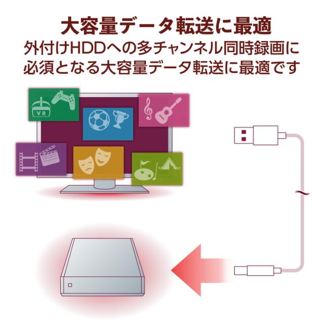 テレビ用外付けハードディスクでの録画時のエラーや再生視聴中のコマ落ちなどを低減する3重シールドの安心設計! 最大6チャンネル同時録画にも対応したUSB3.0ケーブル! 信頼性の高いUSB3.0正規認証品!