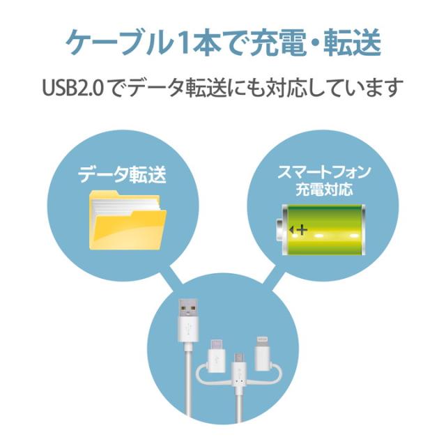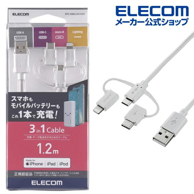 ▲クーポン対象商品(5/1〜5/31)▲ エレコム 3in1 USBケーブル microUSB+Type-C+Lightning 1.2m ホワイト┃MPA-AMBLCAD12WH