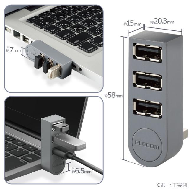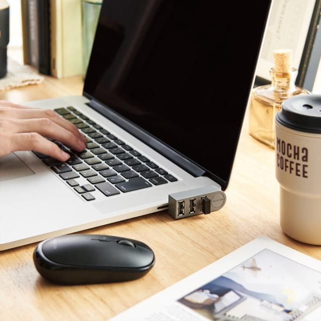 パソコンに挿したままでも邪魔にならない。 ケーブルのない直挿しタイプで、スタイリッシュに使用できるノートパソコン向け3ポートUSBハブ。