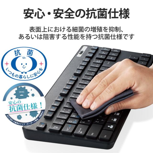 日々のパソコン操作に安心をプラスする抗菌仕様! スマホ・タブレット・パソコンをマルチに接続可能な3台切替機能を搭載したBluetooth(R)5.0薄型テンキーレスキーボード。