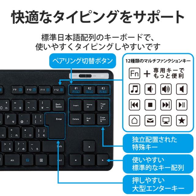 日々のパソコン操作に安心をプラスする抗菌仕様! スマホ・タブレット・パソコンをマルチに接続可能な3台切替機能を搭載したBluetooth(R)5.0薄型テンキーレスキーボード。![]() ■こちらの製品は表面上における細菌の増殖を抑制、あるいは阻害する性能を有したもので、JIS(日本産業規格)が定める抗菌性試験に準拠したものです。 ■省電力を実現するBluetooth(R)5.0 Class2規格に適合しており、Bluetooth(R) 4.0以降に対応したパソコンやタブレットであれば、レシーバ無しで接続できます。※Bluetooth(R)に対応していないパソコンやタブレットでも、規格に適合したBluetooth(R)アダプタを用意することで使用可能です。(推奨Bluetooth(R)アダプタ:LBT-UAN05C2シリーズ(別売)) ■最大3台のマルチペアリングに対応し、切り替えボタンを押すことで登録したデバイスを瞬時に切り替えることができます。 ■WindowsやAndroid/macOS/iOSのそれぞれに最適化した入力モードを搭載しています。 ■サクサクと軽い打ち心地を実現したキー設計を採用した薄型キーボードです。 ■キーを押した際の重さが、当社従来品と比較して約18%軽くなっており、小さい力でキー入力することができます。※TK-FDM075TBKと比較 ■キーストローク2.5mmの薄型キーを採用し、素早いキー入力を実現します。 ■最薄部は約12.7mmで、スタイリッシュな薄型設計です。 ■タイピングしやすい、JIS規格準拠の標準日本語配列のキーボードです。 ■デスク周りのスペースを有効に使えるテンキーレスのコンパクトタイプです。 ■大型のエンターキーや、独立して配置されたDeleteやInsertなどの特殊キーにより、誤入力しにくく快適なキータイピングが行えます。打鍵しやすいキーピッチ19mmで快適なタイピングが可能です。 ■Android端末で、キーボードの印字通りのキー入力ができるエレコム独自のアプリ「ELECOM Keyboard layout」に対応しています。 ※AndroidOSは、ご使用端末の仕様によりかな入力ができない場合があります。 ■姿勢に合わせて傾斜角を2段階で調整できる角度調整スタンドが付いています。スタンドにはしっかりしたキータッチに役立つ滑り止めが付いています。 ■キートップをラバードームで支えるメンブレン方式を採用しています。 ■Webブラウザやメディアプレーヤーの機能などを専用キーを押すだけで実行できる13種類のマルチファンクションキーを搭載しています。 ■不使用時の電池の消耗を防止できる電源スイッチを搭載しています。 ■アクセス状況、電池残量を知らせてくれるLEDランプがついています。 ■専用ドライバなどのインストールは不要で、ペアリングするだけですぐに使用可能です。 ![]() ■接続方式:Bluetooth(R)無線方式 ■対応機種:Bluetooth(R)HOGPプロファイルに対応したWindows、Android、macOS、iOS、iPadOS搭載機 ■対応OS(Windows):Windows 11/10/8.1 ■対応OS(macOS):macOS Big Sur 11/macOS Catalina 10.15 ■対応OS(Android):Android 11/10 ■対応OS(iOS):iOS 14 ■対応OS(iPadOS):iPadOS 14 ■対応OS 備考:※各OSの最新バージョンへのアップデートや、サービスパックのインストールが必要になる場合があります。※最新情報は対応表をご確認ください。 ■接続可能台数:3台 ■カラー:ブラック ■通信方式:GFSK方式 ■電波周波数:2.4GHz帯 ■電波到達距離:磁性体(鉄の机など)の上で使用する場合:約3m、非磁性体(木の机など)の上で使用する場合:約10m ※当社環境でのテスト値であり保証値ではありません。 ■キータイプ:メンブレン ■キー配列:92キー(日本語配列) ※iOS、iPadOSではかな入力に対応しておりません。 ■キーピッチ:19.0mm ■キーストローク:2.5mm ■ホットキー数:13キー ■電源(キーボード本体):単4形アルカリ乾電池、単4形マンガン乾電池、単4形ニッケル水素2次電池のいずれか1本 ■想定電池使用期間:アルカリ乾電池使用時の目安 約8カ月 ※1日8時間のパソコン操作を想定 ■外形寸法(キーボード本体):幅360.6mm×奥行142.5mm×高さ25.6mm(スタンド含まず)、幅360.6mm×奥行142.5mm×高さ34.1mm(スタンド時) ■重量(キーボード本体):約455g ※電池含まず ■付属品:動作確認用単4形アルカリ乾電池×1 ■保証期間:6カ月間 ■対応プロファイル:HOGP(HID Over GATT Profile) ■その他:適合規格:Bluetooth 5.0 Class2 |