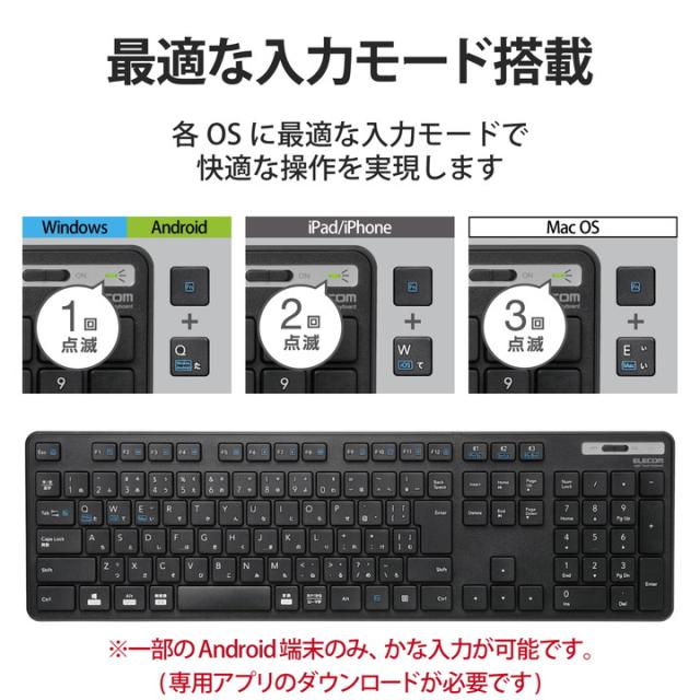 日々のパソコン操作に安心をプラスする抗菌仕様! スマホ・タブレット・パソコンをマルチに接続可能な3台切替機能を搭載したBluetooth(R)5.0薄型フルキーボード。![]() ■こちらの製品は表面上における細菌の増殖を抑制、あるいは阻害する性能を有したもので、JIS(日本産業規格)が定める抗菌性試験に準拠したものです。 ■省電力を実現するBluetooth(R)5.0 Class2規格に適合しており、Bluetooth(R) 4.0以降に対応したパソコンやタブレットであれば、レシーバ無しで接続できます。※Bluetooth(R)に対応していないパソコンやタブレットでも、規格に適合したBluetooth(R)アダプタを用意することで使用可能です。(推奨Bluetooth(R)アダプタ:LBT-UAN05C2シリーズ(別売)) ■最大3台のマルチペアリングに対応し、切り替えボタンを押すことで登録したデバイスを瞬時に切り替えることができます。 ■WindowsやAndroid/macOS/iOSのそれぞれに最適化した入力モードを搭載しています。 ■サクサクと軽い打ち心地を実現したキー設計を採用した薄型キーボードです。 ■キーを押した際の重さが、当社従来品と比較して約18%軽くなっており、小さい力でキー入力することができます。※TK-FDM075TBKと比較 ■キーストローク2.5mmの薄型キーを採用し、素早いキー入力を実現します。 ■最薄部は約12.7mmで、スタイリッシュな薄型設計です。 ■タイピングしやすい、JIS規格準拠の標準日本語配列のキーボードです。 ■数字入力に便利なテンキー付きのフルキーボードで、エクセルなどの作業を効率化します。 ■大型のエンターキーや、独立して配置されたDeleteやInsertなどの特殊キーにより、誤入力しにくく快適なキータイピングが行えます。打鍵しやすいキーピッチ19mmで快適なタイピングが可能です。 ■Android端末で、キーボードの印字通りのキー入力ができるエレコム独自のアプリ「ELECOM Keyboard layout」に対応しています。 ※AndroidOSは、ご使用端末の仕様によりかな入力ができない場合があります。 ■姿勢に合わせて傾斜角を2段階で調整できる角度調整スタンドが付いています。スタンドにはしっかりしたキータッチに役立つ滑り止めが付いています。 ■キートップをラバードームで支えるメンブレン方式を採用しています。 ■Webブラウザやメディアプレーヤーの機能などを専用キーを押すだけで実行できる13種類のマルチファンクションキーを搭載しています。 ■不使用時の電池の消耗を防止できる電源スイッチを搭載しています。 ■アクセス状況、電池残量を知らせてくれるLEDランプがついています。 ■専用ドライバなどのインストールは不要で、ペアリングするだけですぐに使用可能です。 ![]() ■接続方式:Bluetooth(R)無線方式 ■対応機種:Bluetooth(R)HOGPプロファイルに対応したWindows、macOS、Android、iOS、iPadOS搭載機 ■対応OS(Windows):Windows 10/8.1 ■対応OS(macOS):macOS Big Sur 11/macOS Catalina 10.15 ■対応OS(Android):Android 11/10 ■対応OS(iOS):iOS 14 ■対応OS(iPadOS):iPadOS 14 ■対応OS 備考:※各OSの最新バージョンへのアップデートや、サービスパックのインストールが必要になる場合があります。※最新情報は対応表をご確認ください。 ■接続可能台数:3台 ■カラー:ブラック ■通信方式:GFSK方式 ■電波周波数:2.4GHz帯 ■電波到達距離:磁性体(鉄の机など)の上で使用する場合:約3m、非磁性体(木の机など)の上で使用する場合:約10m ※当社環境でのテスト値であり保証値ではありません。 ■キータイプ:メンブレン ■キー配列:109キー(日本語配列) ※iOS、iPadOSではかな入力に対応しておりません。 ■キーピッチ:19.0mm ■キーストローク:2.5mm ■ホットキー数:13キー ■電源(キーボード本体):単4形アルカリ乾電池、単4形マンガン乾電池、単4形ニッケル水素2次電池のいずれか1本 ■想定電池使用期間:アルカリ乾電池使用時の目安 約8カ月 ※1日8時間のパソコン操作を想定 ■外形寸法(キーボード本体):幅441.5mm×奥行127.6mm×高さ25.0mm(スタンド含まず)、幅441.5mm×奥行127.6mm×高さ33.5mm(スタンド時) ■重量(キーボード本体):約515g ※電池含まず ■付属品:動作確認用単4形アルカリ乾電池×1 ■保証期間:6カ月間 ■対応プロファイル:HOGP(HID Over GATT Profile) ■その他:適合規格:Bluetooth 5.0 Class2 |