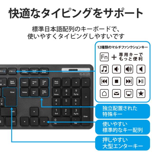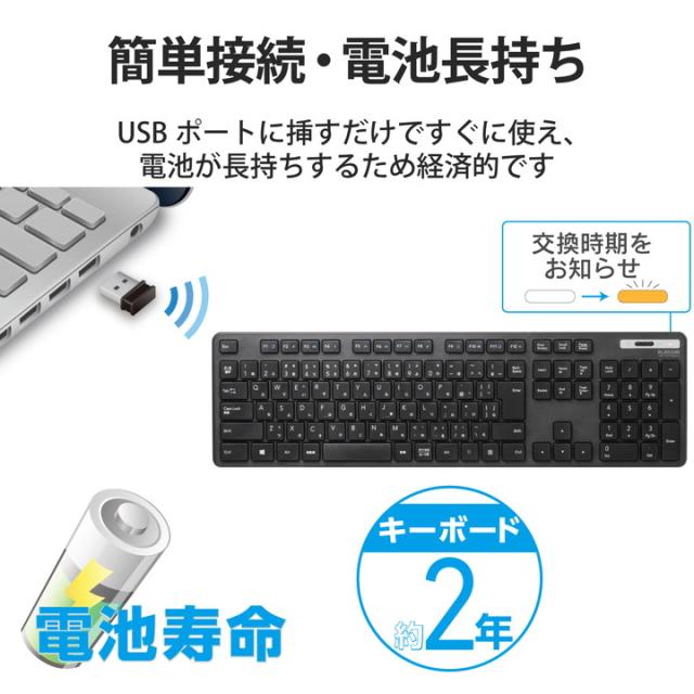 日々のパソコン操作に安心をプラスする抗菌仕様! サクサク軽い打ち心地で、レシーバーをPCに挿すだけで使える無線薄型フルキーボード。![]() ■こちらの製品は表面上における細菌の増殖を抑制、あるいは阻害する性能を有したもので、JIS(日本産業規格)が定める抗菌性試験に準拠したものです。 ■サクサクと軽い打ち心地を実現したキー設計を採用した薄型キーボードです。 ■キーを押した際の重さが、当社従来品と比較して約18%軽くなっており、小さい力でキー入力することができます。※TK-FDM075TBKと比較 ■キーストローク2.5mmの薄型キーを採用し、素早いキー入力を実現します。 ■最薄部は約12.7mmで、スタイリッシュな薄型設計です。 ■タイピングしやすい、JIS規格準拠の標準日本語配列のキーボードです。 ■大型のエンターキーや、独立して配置されたDeleteやInsertなどの特殊キーにより、誤入力しにくく快適なキータイピングが行えます。 ■Webブラウザやメディアプレーヤーの機能などを専用キーを押すだけで実行できる12種類のマルチファンクションキーを搭載しています。 ■1円玉サイズのマイクロレシーバーを採用しており、パソコンのUSBポートに挿すだけで、すぐに使用することができる無線接続タイプです。 ■レシーバーは本体裏面に収納可能です。 ■単4電池1本で使用でき、約2年間電池の交換をせずに使用可能です。(アルカリ乾電池使用時の動作時間目安※弊社環境でのテスト値であり、保証値ではありません。) ■不使用時の電池の消耗を防止できる電源スイッチを搭載しています。 ■電池残量を知らせてくれるLEDランプがついています。 ■数字入力に便利なテンキー付きのフルキーボードで、エクセルなどの作業を効率化します。 ■キートップをラバードームで支えるメンブレン方式を採用しています。 ■打鍵しやすいキーピッチ19mmで快適なタイピングが可能です。 ■姿勢に合わせて傾斜角を2段階で調整できる角度調整スタンドが付いています。 ■スタンドにはしっかりしたキータッチに役立つ滑り止めが付いています。 ![]() ■インターフェース:USB ■コネクター形状:USB(A)オス ■対応機種:USBポートを装備したWindows搭載機 ■対応OS(Windows):Windows 11/10/8.1/7/XP ■対応OS 備考:※各OSの最新バージョンへのアップデートや、サービスパックのインストールが必要になる場合があります。※最新情報は対応表をご確認ください。 ■カラー:ブラック ■通信方式:GFSK方式 ■電波周波数:2.4GHz帯 ■電波到達距離:磁性体(鉄の机など)の上で使用する場合:約3m、非磁性体(木の机など)の上で使用する場合:約10m ※当社環境でのテスト値であり保証値ではありません。 ■キータイプ:メンブレン ■キー配列:109キー(日本語配列) ■キーピッチ:19.0mm ■キーストローク:2.5mm ■ホットキー数:12キー ■電源(キーボード本体):単4形アルカリ乾電池、単4形マンガン乾電池、単4形ニッケル水素2次電池のいずれか1本 ■想定電池使用期間:アルカリ乾電池使用時の目安 約2年 ※1日8時間のパソコン操作を想定 ■外形寸法(キーボード本体):幅441.5mm×奥行127.6mm×高さ25.0mm(スタンド含まず)、幅441.5mm×奥行127.6mm×高さ33.5mm(スタンド時) ■サイズ分類:フルサイズ ■重量(キーボード本体):約515g ※電池含まず ■外形寸法(レシーバー):幅19.5mm×奥行15.8mm×高さ6.5mm ■重量(レシーバー):約2g ■付属品:動作確認用単4形アルカリ乾電池×1、レシーバーユニット×1 ■保証期間:6カ月間 |