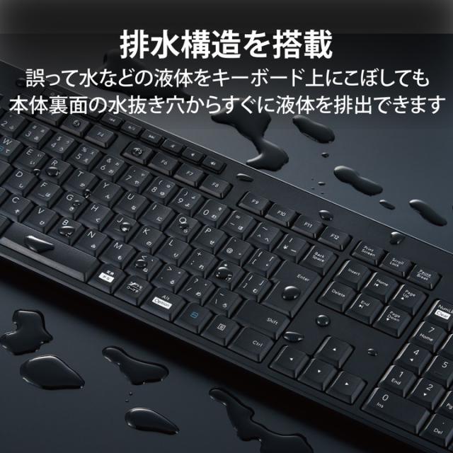 本格静音設計!Windows、Chrome OS、macOSで使用可能。さらに、日々のパソコン操作に安心をプラスする抗菌仕様でワイヤレスタイプの静音フルキーボード・静音マウスセットです。![]() ■音が気になる場所や時間帯での使用に最適なワイヤレスタイプの静音フルキーボードに静音ワイヤレスマウスが付いたセットモデルです。数字入力に便利なテンキー付きのフルキーボードで、エクセルなどの作業を効率化します。 ■各キートップに装着したシリコンラバーによって従来品と比べて打鍵音を9割以上低減。公共施設や会議室、夜中や朝方など音が気になる場所や時間帯での使用に最適です。 ※1 ■※1 本製品(約15dB)と従来モデルTK-FCM062BK(約45dB)の打鍵音の音圧レベルから算出した音エネルギーの大きさを比較した結果です。音エネルギーとは、測定した音圧レベル(ベル値)と基準値(人間が聞き取れる最小の音の大きさ)から算出した値です。 ■独自のファームウェアを搭載することにより、Windows、Chrome OS、macOSで使用可能です。 ■誤って水などの液体をキーボード上にこぼしても、本体裏面の水抜き穴からすぐに液体を排出できる排水機構を搭載しています。(防水設計ではありません) ■抗菌加工によって、菌の繁殖を抑え、清潔に保ちます。(抗菌範囲:キーボード筐体、印刷部分) ※2 ■※2 こちらの製品は表面上における細菌の増殖を抑制、あるいは阻害する性能を有したもので、JIS(日本産業規格)が定める抗菌性試験に準拠したものです。 ■キーボードの上段には、特定の機能を素早く実行できる“ホットキー”を搭載しています。専用キーを押すだけでメディアプレーヤーの起動、音量や明るさの調整など、9種類の操作が可能です。 ■キートップをラバードームで支える“メンブレン方式”を採用しています。 ■キートップにはスタイリッシュで見やすいオリジナルフォントを使用しています。 ■大型のエンターキーや、独立して配置されたDelete、Insertなどの特殊キーにより、誤入力しにくく快適なキータイピングが行えます。また、打鍵しやすいキーピッチ19mmで快適なタイピングが可能です。 ■キーボード、マウスとも不使用時の電池の消耗を防止できる“電源スイッチ”付きです。また、電池残量を知らせてくれるLEDランプがついています。 ■姿勢に合わせて傾斜角を2段階で調整できる“角度調整スタンド”付き。また、スタンドにはしっかりしたキータッチに役立つ“すべり止め”が付いています。 ■パソコンのUSBポートにレシーバーユニットを挿すだけですぐに使用できるワイヤレスタイプです。レシーバーひとつでキーボードとマウスを接続可能なため、USBポートが少ない薄型パソコンなどにもおすすめです。 ■専用ドライバなどのインストールは不要で、接続するだけですぐに使用できます。 ■パソコンに挿したままでも気にならない“1円玉サイズのマイクロレシーバー”を採用しています。また、レシーバーは本体に収納可能なため、紛失しにくく、持ち運びにも便利です。 ■クリック時のカチカチ音が気にない静音ワイヤレスマウスを付属しています。左右ボタンとホイールボタンに加え、「進む」、「戻る」を含めた5ボタンすべてにサイレントスイッチを採用し、しっかりとした押し心地がありながら静かに使用できます。 ■マウスのセンサーには、小さな凹凸や埃がある環境でも正確にポインタを動かせる“BlueLED”センサーを搭載。木製・樹脂製など様々な材質のデスクや、ノート、テーブルクロスの上などでも快適に操作できます。 ■マウスの分解能は、スムーズな操作を実現する1600カウントです。 ■紙と最小限の環境配慮プラスチックを使用した環境にやさしいパッケージを採用しています。また、ユーザーズマニュアルをオンライン化し、紙の使用量削減にも取り組んでいます。 ■自社環境認定基準を1つ以上満たし、『THINK ECOLOGY』マークを表示した製品です。 ■廃棄物削減に取り組み、製品に同梱する取扱説明書等をペーパーレス化した製品です。 ![]() ■セット構成:無線静音フルキーボード×1、無線静音BlueLEDマウス×1、共通レシーバー×1、動作確認用単4形アルカリ乾電池×4 ■インターフェース:USB ■コネクター形状:USB-Aオス ■対応機種:USBポートを装備したWindows、macOS、Chrome OS搭載機 ■対応OS(Windows):Windows 11/10/8.1 ■対応OS(macOS):macOS Big Sur 11 ■対応OS(その他):ChromeOS ■対応OS 備考:※各OSの最新バージョンへのアップデートや、サービスパックのインストールが必要になる場合があります。 ※最新情報は対応表をご確認ください。 ■カラー:ブラック ■通信方式:GFSK方式 ■電波周波数:2.4GHz帯 ■電波到達距離:磁性体(鉄の机など)の上で使用する場合:約3m、非磁性体(木の机など)の上で使用する場合:約10m ※当社環境でのテスト値であり保証値ではありません。 ■キーボード・キータイプ:メンブレン ■キーボード・キー配列:109キー+9キー(日本語配列) ■キーボード・キーピッチ:19mm ■キーボード・キース