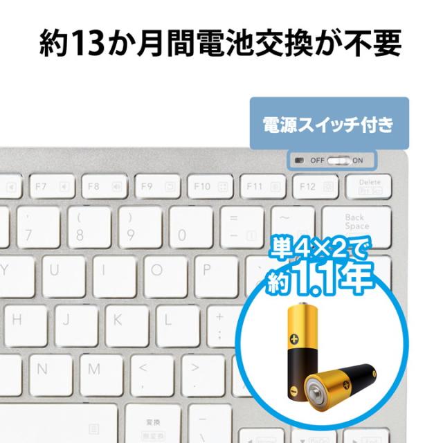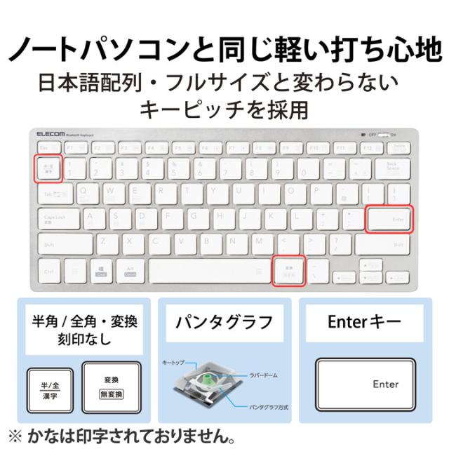 持ち運びに便利な最薄部6.5mm・重さ264gの薄型・軽量設計! ペアリングした最大3台までのデバイスを瞬時に切り替えられるBluetooth(R)パンタグラフミニキーボード。![]() ■持ち運びに便利な最薄部が6.5mm、重さが264gの薄型・軽量Bluetooth(R)パンタグラフミニキーボードです。 ■省電力を実現するBluetooth(R)3.0 Class2規格に適合しており、Bluetooth(R)に対応したパソコンやタブレットであれば、レシーバ無しで接続できます。 ■※Bluetooth(R)に対応していないパソコンやタブレットでも、規格に適合したBluetooth(R)アダプタを用意することで使用可能です。(推奨Bluetooth(R)アダプタ:LBT-UAN05C2(別売)) ■パソコンやタブレット、スマートフォンなど、最大3台までのデバイスをペアリング可能です。切り替えボタンを押すことで登録したデバイスを瞬時に切り替えることができます。 ■専用ドライバなどのインストールは不要で、ペアリングするだけですぐに使用可能です。 ■キータイプには、ノートパソコンのキーボードと同じ「パンタグラフ方式」を採用しています。 ■Windows OS、Android OS/macOS/iOS、iPadOSのそれぞれに最適化した入力モードを搭載しています。 ■コンパクトながら19mmのキーピッチと、日本語78キーを採用し、快適なタイピングが可能です。 ■キートップにはスタイリッシュで見やすいオリジナルフォントを使用しています。 ■Webブラウザやメディアプレーヤーの機能などを専用キーを押すだけで実行できる13種類のマルチファンクションキーを搭載しています。 ■Android端末で、キーボードの印字通りのキー入力ができるエレコム独自のアプリ「ELECOM Keyboard layout」に対応しています。 ■外出先での使用にも安心な電池式です。 ■不使用時の電池の消耗を防止できる電源スイッチを搭載しています。 ■電源ON、ペアリング状況などが分かるLEDランプがついています。 ■自社環境認定基準を1つ以上満たし、『THINK ECOLOGY』マークを表示した製品です。 ■廃棄物削減に取り組み、製品に同梱する取扱説明書等をペーパーレス化した製品です。 ![]() ■接続方式:Bluetooth(R)無線方式 ■対応機種:Bluetooth(R)HIDプロファイルに対応したPC、タブレット、スマートフォン ■対応OS(Windows):Windows 11/10/8.1 ■対応OS(Android):Android 9 ■対応OS(macOS):macOS Catalina 10.15 ■対応OS(iOS):iOS 13.4 ■対応OS(iPadOS):iPadOS 13.4 ■対応OS 備考:※各OSの最新バージョンへのアップデートや、サービスパックのインストールが必要になる場合があります。※最新情報は対応表をご確認ください。 ■接続可能台数:3台 ■カラー:シルバー ■通信方式:GFSK方式 ■電波周波数:2.4GHz帯 ■電波到達距離:磁性体(鉄の机など)の上で使用する場合:約3m、非磁性体(木の机など)の上で使用する場合:約10m ※当社環境でのテスト値であり保証値ではありません。 ■キータイプ:パンタグラフ ■キー配列:78キー(日本語配列) ※iOSのかな入力には対応していません。 ■キーピッチ:19.0mm ■キーストローク:2.0mm ■ホットキー数:13キー ■電源(キーボード本体):単4形アルカリ乾電池、単4形マンガン乾電池、単4形ニッケル水素2次電池のいずれか2本 ■想定電池使用期間:アルカリ乾電池使用時の目安 約1.1年 ※当社テスト値 ■外形寸法(キーボード本体):幅286.5mm×奥行121.5mm×高さ20.4mm ■重量(キーボード本体):約264g ※電池を含まず ■付属品:ユーザーズマニュアル×1、動作確認用単4形アルカリ乾電池×2 ■保証期間:6カ月間 ■対応プロファイル:HID(Human Interface Device) ■その他:適合規格:Bluetooth 3.0 Class2 |