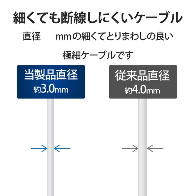 細くてとりまわしの良い極細ケーブルタイプ。 USB-A端子を搭載したパソコン・充電器と、USB Type-C(TM)端子を搭載したスマートフォンを接続して充電・データ通信ができるUSBケーブル