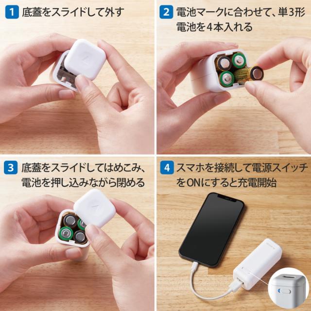 万が一の際でも乾電池があればスマートフォンなどを充電できる。単3形アルカリ乾電池(又はニッケル水素電池)4本でスマートフォンや小型電子機器などを充電できるモバイルバッテリーです。単3形アルカリ乾電池が4本付属しており、ご購入後すぐに使用可能です。USB-Aポートを1つ搭載しています。防災グッズとしてご自宅の常備にもおすすめです。
