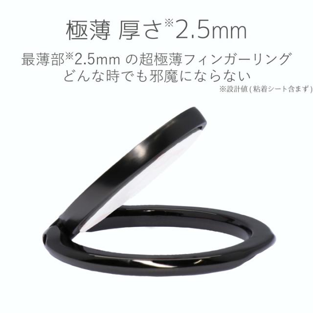 厚み約2.5mmの極薄設計※。 背面に貼りつけてスマートフォンの落下を防ぐ、薄くて邪魔にならないフィンガーリング。 ※最薄部・設計値(粘着シートを含まず)
