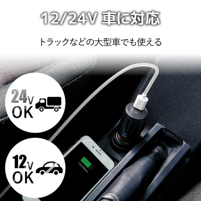 最大合計出力2.4Aでスマホやタブレットを充電できるUSBポート・1ポート付き。車の中でスマートフォンやタブレットの音楽などをワイヤレスで楽しめるBluetooth(R)FMトランスミッター。