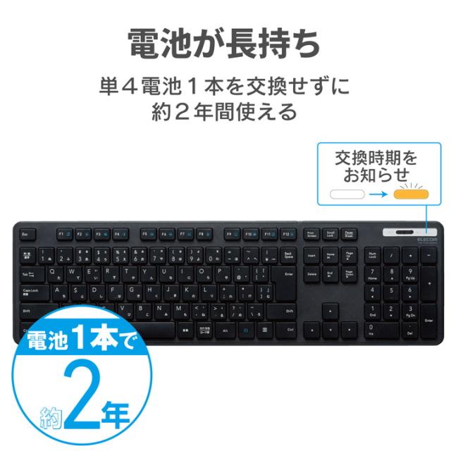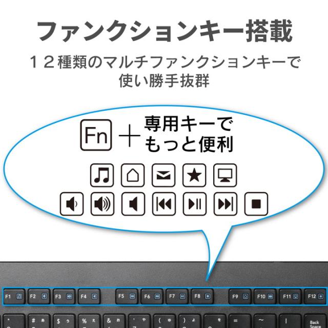 キー入力がはかどる、サクサク軽い打ち心地。 レシーバーをPCに挿すだけの簡単接続で、デスク周りをすっきり使える無線薄型フルキーボード。![]() ■サクサクと軽い打ち心地を実現したキー設計を採用した薄型キーボードです。 ■キーを押した際の重さが、当社従来品と比較して約18%軽くなっており、小さい力でキー入力することができます。※TK-FDM075TBKと比較 ■キーストローク2.5mmの薄型キーを採用し、素早いキー入力を実現します。 ■最薄部は約12.7mmで、スタイリッシュな薄型設計です。 ■タイピングしやすい、JIS規格準拠の標準日本語配列を採用しています。 ■大型のエンターキーや、独立して配置されたDeleteやInsertなどの特殊キーにより、誤入力しにくく快適なキータイピングが行えます。 ■ボリューム操作やメディアプレーヤーの操作などを専用キーを押すだけで実行できる12種類のマルチファンクションキーを搭載しています。 ■1円玉サイズのマイクロレシーバーを採用しており、パソコンのUSBポートに挿すだけで、すぐに使用することができる無線接続タイプです。 ■レシーバーは本体裏面に収納可能です。 ■単4電池1本で使用でき、約2年間電池の交換をせずに使用可能です。(アルカリ乾電池使用時の動作時間目安※弊社環境でのテスト値であり、保証値ではありません。) ■不使用時の電池の消耗を防止できる電源スイッチを搭載しています。 ■電池の交換時期をお知らせする電池残量表示ランプを装備しています。 ■数字入力に便利なテンキー付きのフルキーボードで、エクセルなどの作業を効率化します。 ■キートップをラバードームで支えるメンブレン方式を採用しています。 ■キートップにはスタイリッシュで見やすいオリジナルフォントを使用しています。 ■打鍵しやすいキーピッチ19mmで快適なタイピングが可能です。 ■姿勢に合わせて傾斜角を2段階で調整できる角度調整スタンドが付いています。 ■スタンドにはしっかりしたキータッチに役立つ滑り止めが付いています。 ![]() ■インターフェース:USB ■コネクター形状:USB(A)オス ■対応機種:USBポートを装備したWindows搭載機 ■対応OS(Windows):Windows 11/10/8.1/7/XP ■対応OS 備考:※各OSの最新バージョンへのアップデートや、サービスパックのインストールが必要になる場合があります。 ■カラー:ブラック ■通信方式:GFSK方式 ■電波周波数:2.4GHz帯 ■電波到達距離:磁性体(鉄の机など)の上で使用する場合:約3m、非磁性体(木の机など)の上で使用する場合:約10m ※当社環境でのテスト値であり保証値ではありません。 ■キータイプ:メンブレン ■キー配列:109キー(日本語配列) ■キーピッチ:19.0mm ■キーストローク:2.5mm ■ホットキー数:12キー ■電源(キーボード本体):単4形アルカリ乾電池、単4形マンガン乾電池、単4形ニッケル水素2次電池のいずれか1本 ■想定電池使用期間:アルカリ乾電池使用時の目安 約2年 ※当社テスト値 ■外形寸法(キーボード本体):幅441.5mm×奥行127.6mm×高さ25.0mm(スタンド含まず)、幅441.5mm×奥行127.6mm×高さ33.5mm(スタンド時) ■サイズ分類:フルサイズ ■重量(キーボード本体):約505g ※電池含まず ■外形寸法(レシーバー):幅19.5mm×奥行15.8mm×高さ6.5mm ■重量(レシーバー):約2g ■付属品:ユーザーズマニュアル×1、動作確認用単4形アルカリ乾電池×1、レシーバーユニット×1 ■保証期間:6カ月間 |