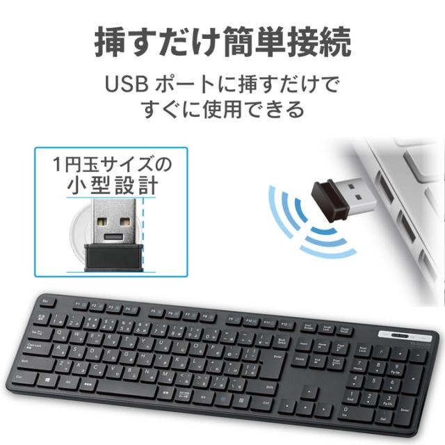 キー入力がはかどる、サクサク軽い打ち心地。 レシーバーをPCに挿すだけの簡単接続で、デスク周りをすっきり使える無線薄型フルキーボード。