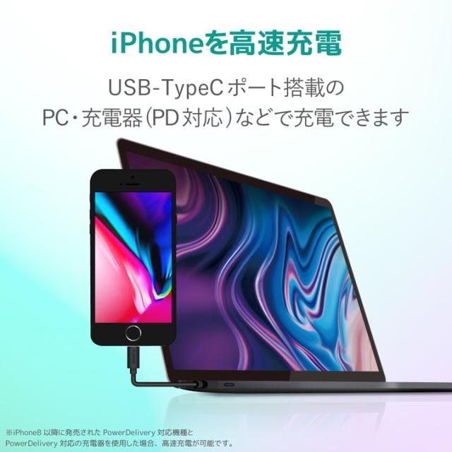 iPhoneの高速充電に対応。 Lightningコネクタを搭載したiPhoneなどとUSB-Cポートを搭載したパソコンや充電器を接続し、充電・データ転送ができるUSB-C to Lightningケーブル。