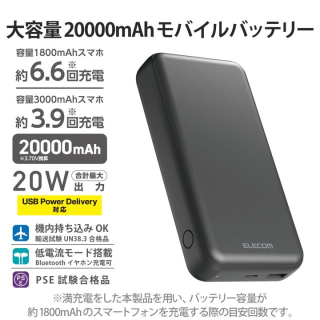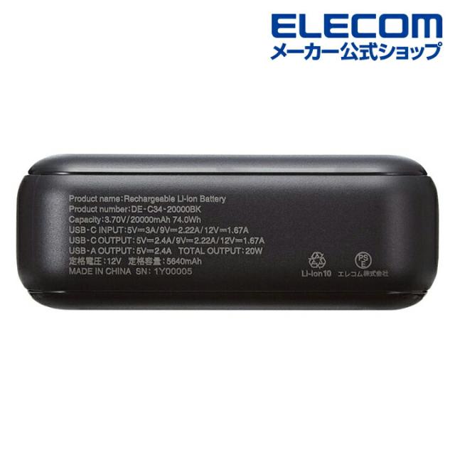 エレコム モバイルバッテリー 20000mAh 大容量 ポートC 20W + ポートA 12W USB PD準拠 20W ブラック┃DE-C34-20000BK