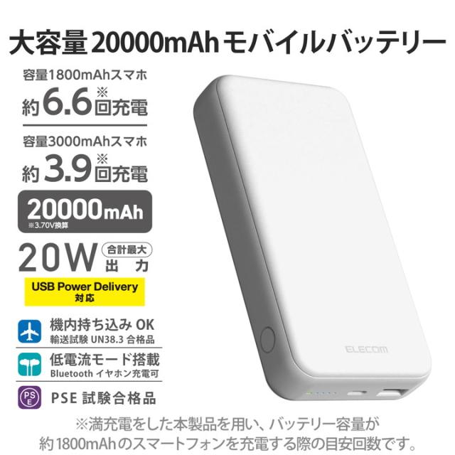 エレコム モバイルバッテリー 20000mAh 大容量 ポートC 20W + ポートA 12W USB PD準拠 20W ホワイト┃DE-C34-20000WH