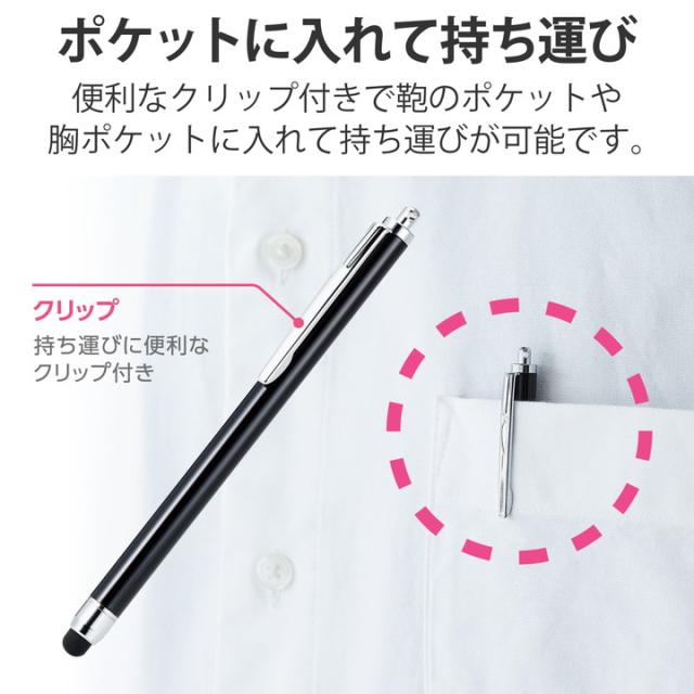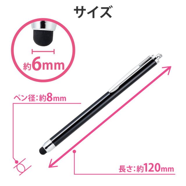 細菌の増殖を抑える抗菌加工済み!シリコンタイプのペン先により、しっかりし安定したタッチ感を実現したタッチペンです。![]() ■持ち手部分に抗菌加工を施し、細菌の増殖を防ぐ抗菌加工タッチペンです。 ■JIS Z 2801規格(抗菌加工製品—抗菌性試験方法)に適合しています。 ■シリコンタイプのペン先により、しっかりし安定したタッチ感を実現します。 ■シリコン製のやわらかなペン先で、液晶画面を傷つけません。 ■指先でのタッチ操作と違い、液晶画面を汚さずに操作可能です。 ■タッチ操作はもちろん、スライド操作も快適に行えます。 ■※液晶保護フィルムをご使用の際は、フィルムの種類によっては、操作時にこすれ音が生じたり、ペンの反応が悪くなることがあります。 ■胸ポケットなどに入れて持ち運ぶのに便利なクリップが付いています。 ![]() ■対応機種:各種スマートフォン・タブレット ※特定のアプリ/ソフトをご使用の際に、専用タッチペンのみでの描写設定をされている場合はご使用できない場合があります。 ■外形寸法:長さ約120mm×ペン径約8mm ペン先約6mm ■材質:ペン先:シリコン、本体:アルミニウム ■ストラップ有無:× ■カラー:ブラック |