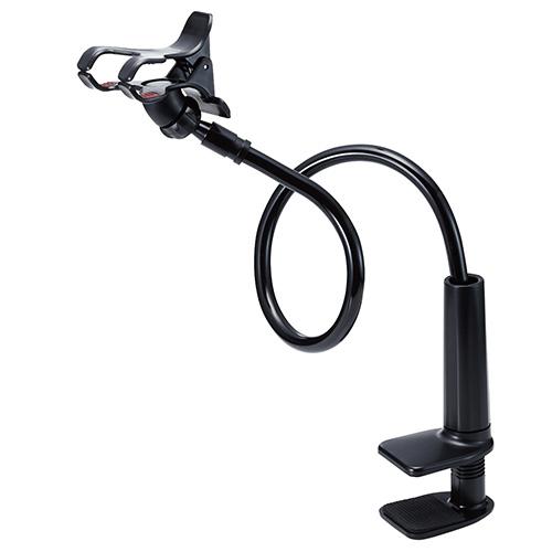 お好みの場所にクランプでしっかり固定ができ、フレキシブルアームで自由に角度調節ができる、全長80cmのスマートフォン用ロングアームスタンドです。